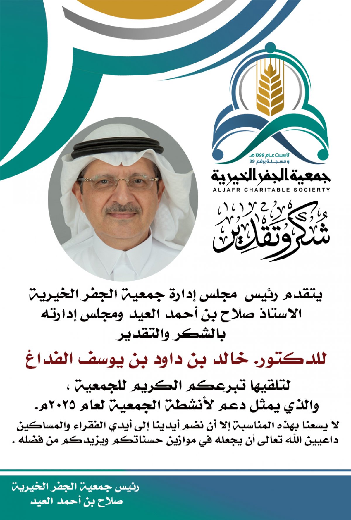 الدكتور . خالد بن داود الفداغ يدعم مشاريع وأنشطة جمعية الجفر الخيرية لعام 2025م