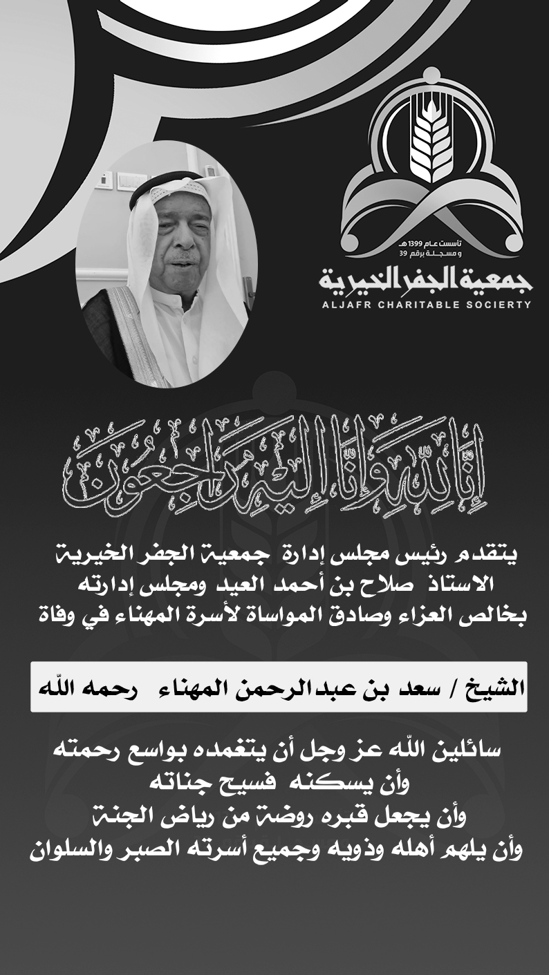 جمعية الجفر الخيرية تعزي اسرة سعد ين عبدالرحمن المهناء رحمه الله